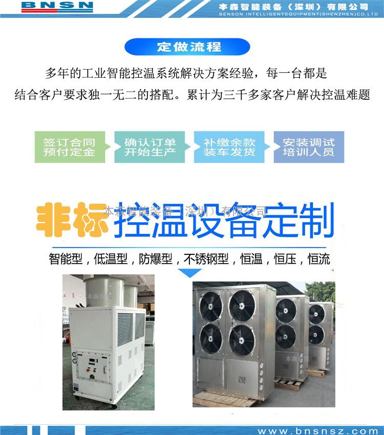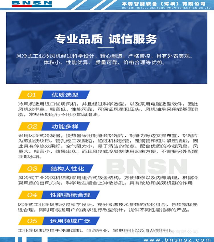 Benson Intelligent Equipment (Shenzhen) Co., Ltd. is a refrigeration equipment company. It is a refrigeration company integrating research and development, manufacturing, sales and service. BNSN has many years of experience in R & D, manufacturing and production, integrates modern and integrated management, and strictly implements ISO90012000 and CE EU management system standards, allowing the company to continuously move forward in its development. In order to improve market competitiveness, the company selects a large number of high-quality parts from the United States, Japan, Europe and other countries, and introduces various advanced processing equipment, such as CNC processing equipment, AMADA CNC punching machines, CNC folding machines, automatic constant temperature test stands, etc., which greatly improves product quality. The company has many engineers and managers to create batches of high-quality refrigeration equipment. For a long time, Benson Intelligent Company has cultivated a large number of loyal partners relying on its excellent equipment and integrity. Its products are exported to Europe, America, Africa and other countries, and are very popular among customers. We hope that through our technical level and unremitting efforts, we will become a leading refrigeration company and create optimized energy-saving solutions tailored to customers. In order to meet the needs of different customers in the process of industrial development, Benson Intelligent Equipment Co., Ltd. has hired many domestic and foreign engineers to join hands with well-known domestic universities and scientific research institutes to jointly develop a complete variety and complete function of air-cooled screw units, water-cooled screw units, air-cooled chillers, water-cooled chillers, constant temperature chillers, cold and hot integrated machines, open chillers, industrial chillers, explosion-proof chillers, low-temperature chillers (freezers), Saltwater freezer, glycol freezer, laser chiller, PCB special chiller, electroplating chiller, chemical chiller, food special chiller, medicine special chiller, breeding special chiller, injection special chiller, concrete special chiller, invasive chiller (oil chiller), air chiller, water-transporting mold warmer, oil-transporting mold warmer, cooling tower and other fully automatic intelligent control refrigeration equipment. At the same time, industrial refrigeration equipment with different refrigerants and power supply voltages has been developed for overseas markets.- Name(chinese)